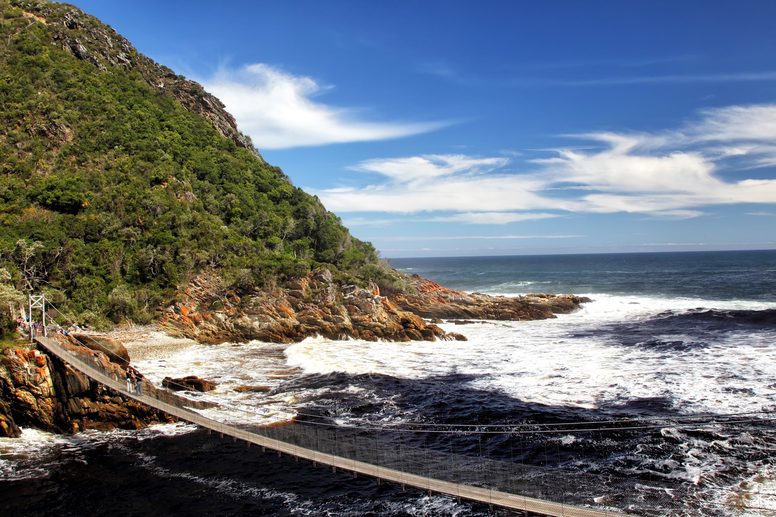 The Tsitsikamma Coastal National Park at the Eastern edge of the Garden Route, stretches 67 kilometers along some of the most spectacular coastline of Southern Africa. The main access to the park takes one to the mouth of the Storms River, where the dark peat stained river waters which have flowed through deep gorges finally meet the ultramarine blue ocean. The scenic drive from Knysna takes about 70 minutes (110km). One has the choice of taking the fast toll road over the giant Bloukrans and Groot River gorges or meander slowly through the passes on the old road. You can watch the bungee jumping from the Blaaukraans view site. Or if you are brave enough, try the worlds highest jump yourself!! The tourist camp at the Storms River mouth is the start of the popular Otter Trail and has a restaurant and shop. Walk along the coast and examine the interesting rock pools or just sit and watch the waves making great masses of white foam as they crash onto the rocky coast. The forest nature trail to the river mouth and across the suspension bridge is a must. Make an early start from Knysna and enjoy a day filled with the wonders of Nature.